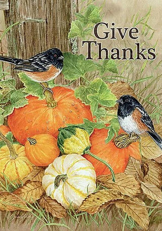 Add the perfect splash of fall color to your décor! The LANG Give Thanks Flag features two birds perched on colorful pumpkins and gourds.