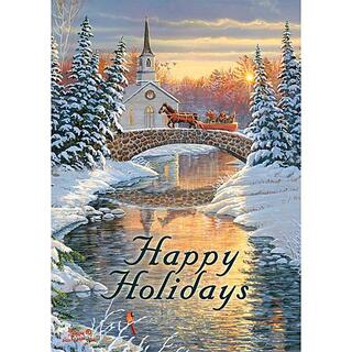 Sam Timm's artwork features a snowy background with a horse pulling a carriage full with people across a bridge on a cold day. The Winter Crossing Large Garden Flag would be a perfect addition to your yard during Christmastime with the words "Happy Holidays" featured on it! When displayed, the flag measures 28" x 40".
