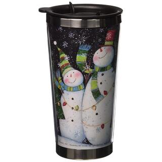 Let the Three Snowman Travel Mug bring cheer to every sip of your favorite brew whether you're enjoying it at home or on the go. Renowned watercolor artist Susan Winget uses bright colors and adorable snowmen to capture the heartwarming spirit of the holiday season on the clear plastic-protected, art-wrapped exterior of this stunning LANG travel mug. With a spill-resistant lid to prevent spillage while on the run and a stainless steel interior to keep your coffee warm, this 16 ounce Three Snowmen Travel Mug is perfect for the busy coffee lover on the go!