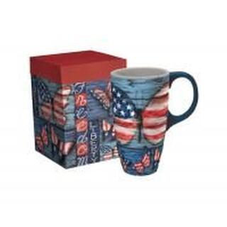 Let the Liberty Latte Mug enhance your morning routine with a cheerful cup of coffee or tea. Renowned artist Susan Winget creates a vivid, art wrapped exterior for this charming 18 oz. latte mug featuring a butterfly painted in American glory. The included coordinating gift box also features the patriotic butterfly captured on the mug for an impressive gift for a special friend or coworker. Show your love of coffee with an exceptional LANG latte mug and get your Liberty Latte Mug today!